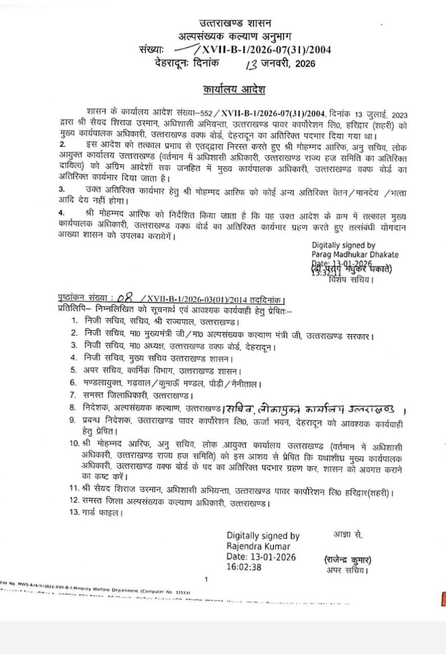 शासन ने मोहम्मद आरिफ, अनु सचिव, लोक आयुक्त कार्यालय उत्तराखंड (वर्तमान में अधिशासी अधिकारी, उत्तराखंड राज्य हज समिति) को आगामी आदेशों तक उत्तराखंड वक्फ बोर्ड, देहरादून के मुख्य कार्यपालक अधिकारी का अतिरिक्त प्रभार सौंपने के निर्देश दिए हैं।